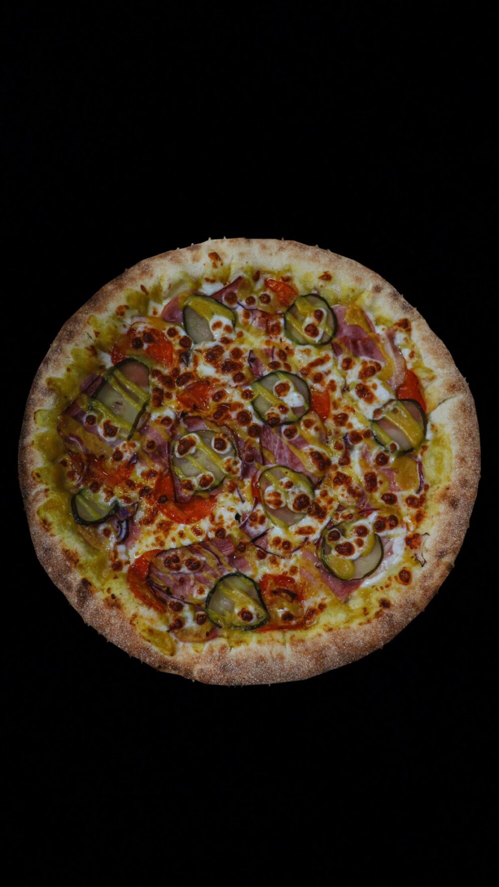 Горчичный соус , сыр моцарелла, красный лук, ветчина, пепперони, бекон, маринованные огурцы
