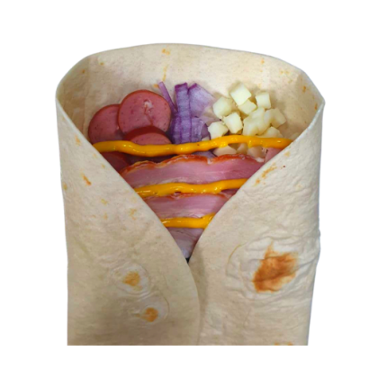 Тортилья пшеничная, сыр моцарелла, куриное филе, томаты, ветчина, чесночный соус