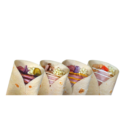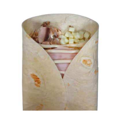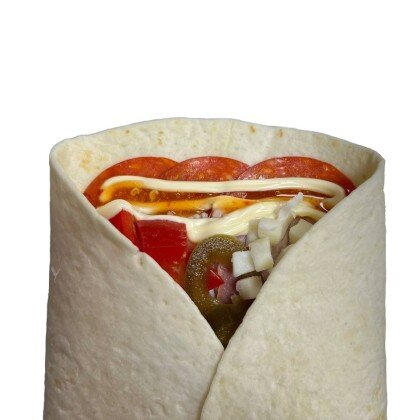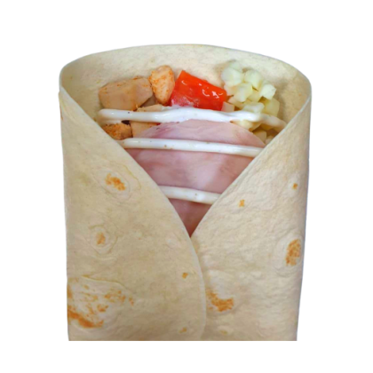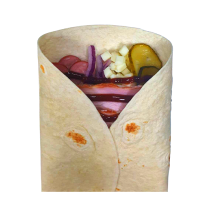 Тортилья пшеничная, сыр моцарелла, красный лук, грудинка, охотничьи колбаски, горчичный соус